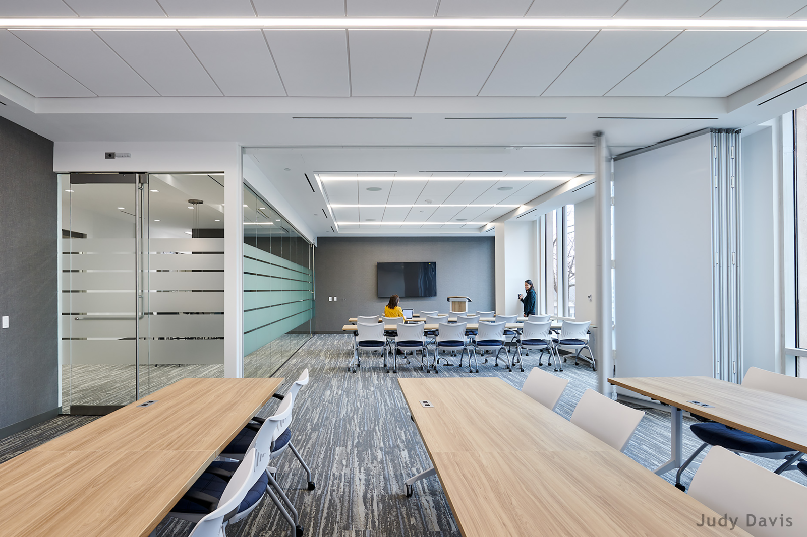 This beautiful new space includes a Monumental Markets lounge, a kitchenette, conference rooms for training, and a vestibule that includes collaboration space for tenants. The space was designed with new LED lighting, floor devices, and VAV boxes.
