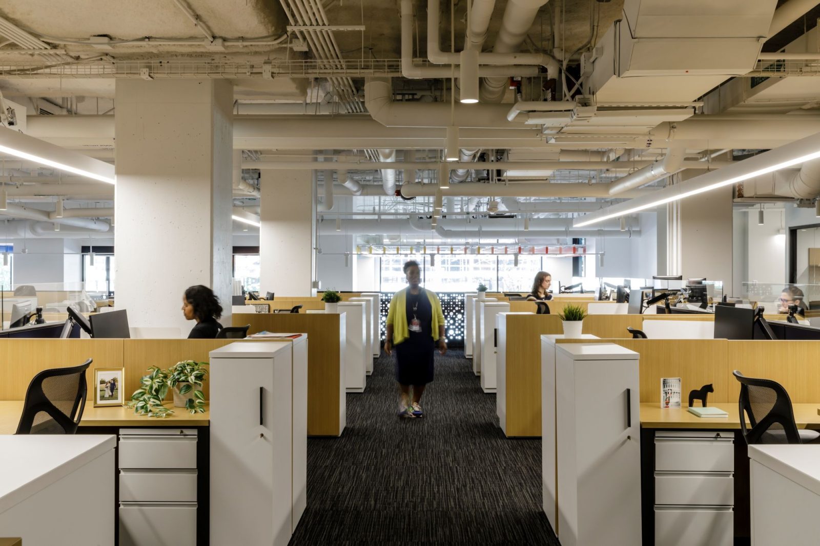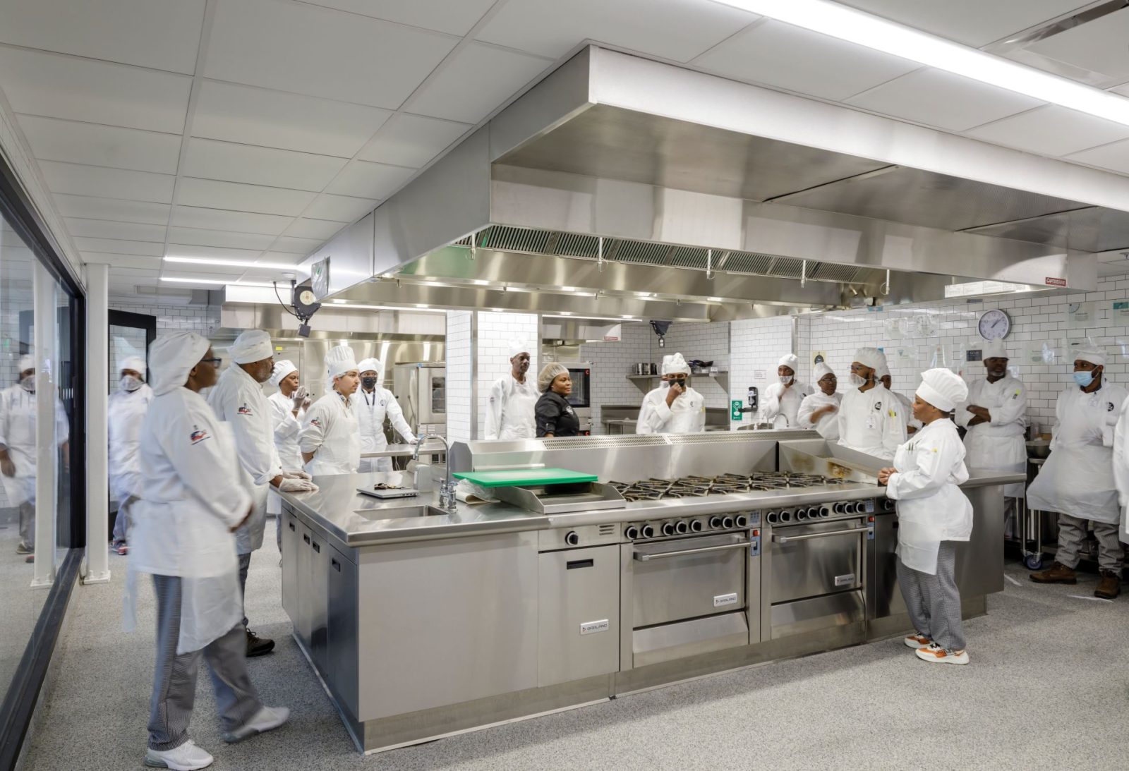 The state-of-the-art facility includes production and training cooking kitchens, a demonstration kitchen, retail café, podcast room, reception area, executive offices, operations office, dry & cold storage, prep areas, dish room, volunteer work areas, training rooms, restrooms, and other support areas on the first level. The main kitchen and training kitchen include five kitchen hoods and a comprehensive air scrubber system. The mezzanine level, which serves as DCCK’s administrative space, includes an elevator lift for ADA access, conference room, open work areas, private offices, storage areas, mother’s room, restrooms, and other support areas. The DCCK office and cooking area include an interconnecting stair. Supplemental AC was designed for IT requirements. Bipolar ionization was added to the HVAC system for COVID-19 mitigation. The project, which has achieved FitWel 3-Star certification, employs healthy design strategies, such as natural daylighting, active circulation, and wellness-oriented amenities to bolster occupant wellbeing.