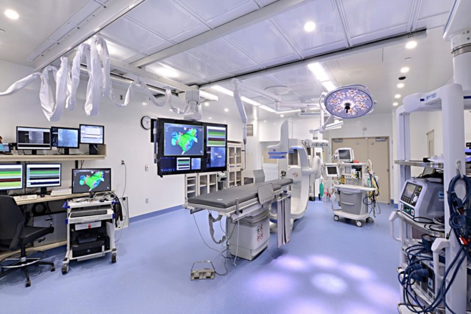 At the heart of this suite is the hospital’s hybrid operating room, equipped with both imaging equipment to perform minimally invasive procedures and all the equipment needed for a traditional surgery. In addition to the hybrid operating room, the suite also features an electrophysiology lab and angiography suite, both constructed and designed as imaging operating rooms.