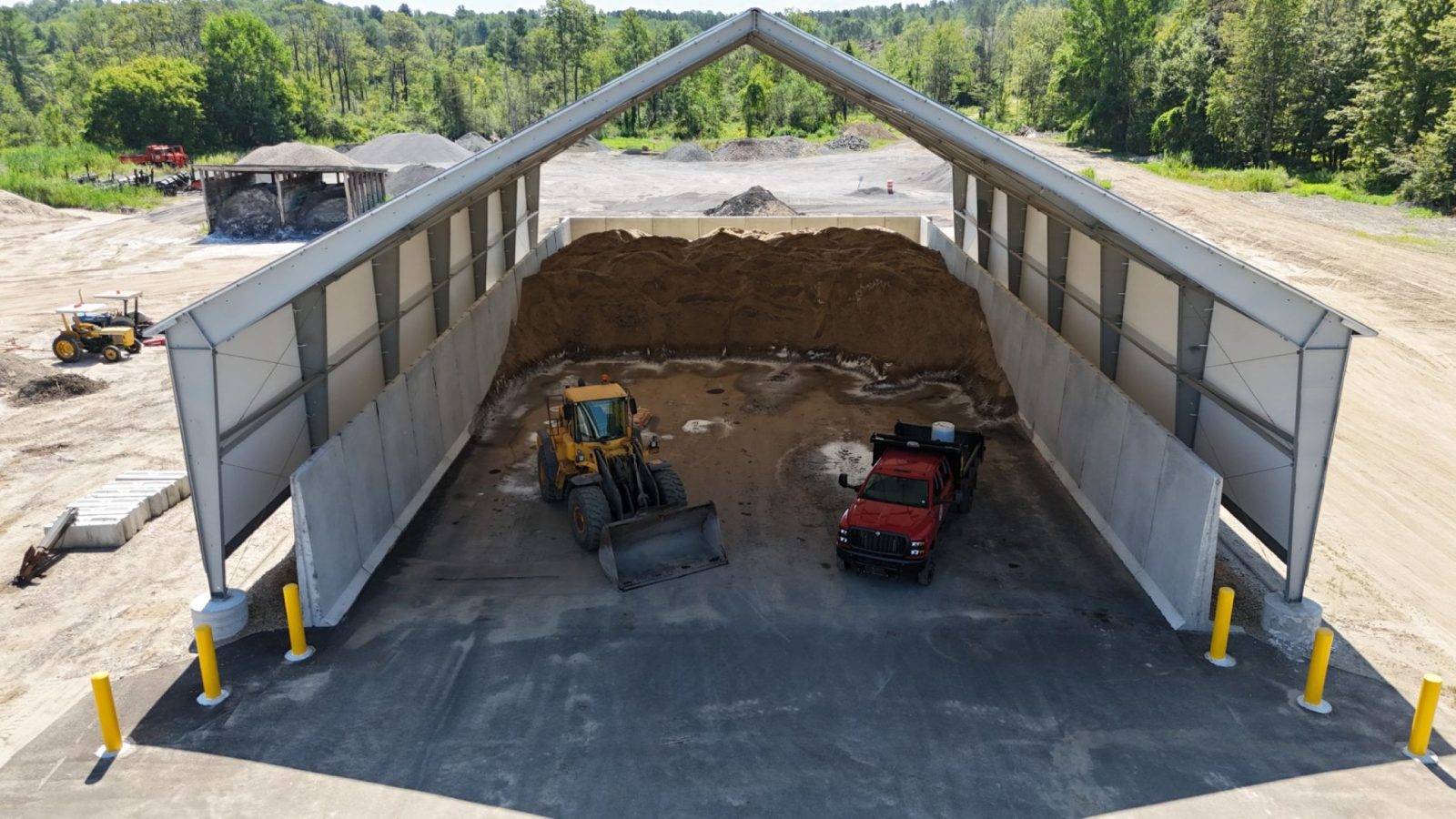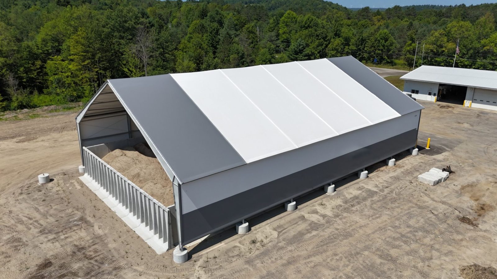 The team provided structural, geotechnical, site, and construction administration services for a new heavy‑duty salt barn constructed at the Town’s Department of Public Works facility. The rigid steel frame structure measures approximately 260 feet long, 85 feet wide, and 42 feet high and is enclosed with a high‑performance, tensioned fabric cover. The facility was designed to store 6,000 cubic yards of sand and salt to maintain the Town’s road network throughout a typical winter season.